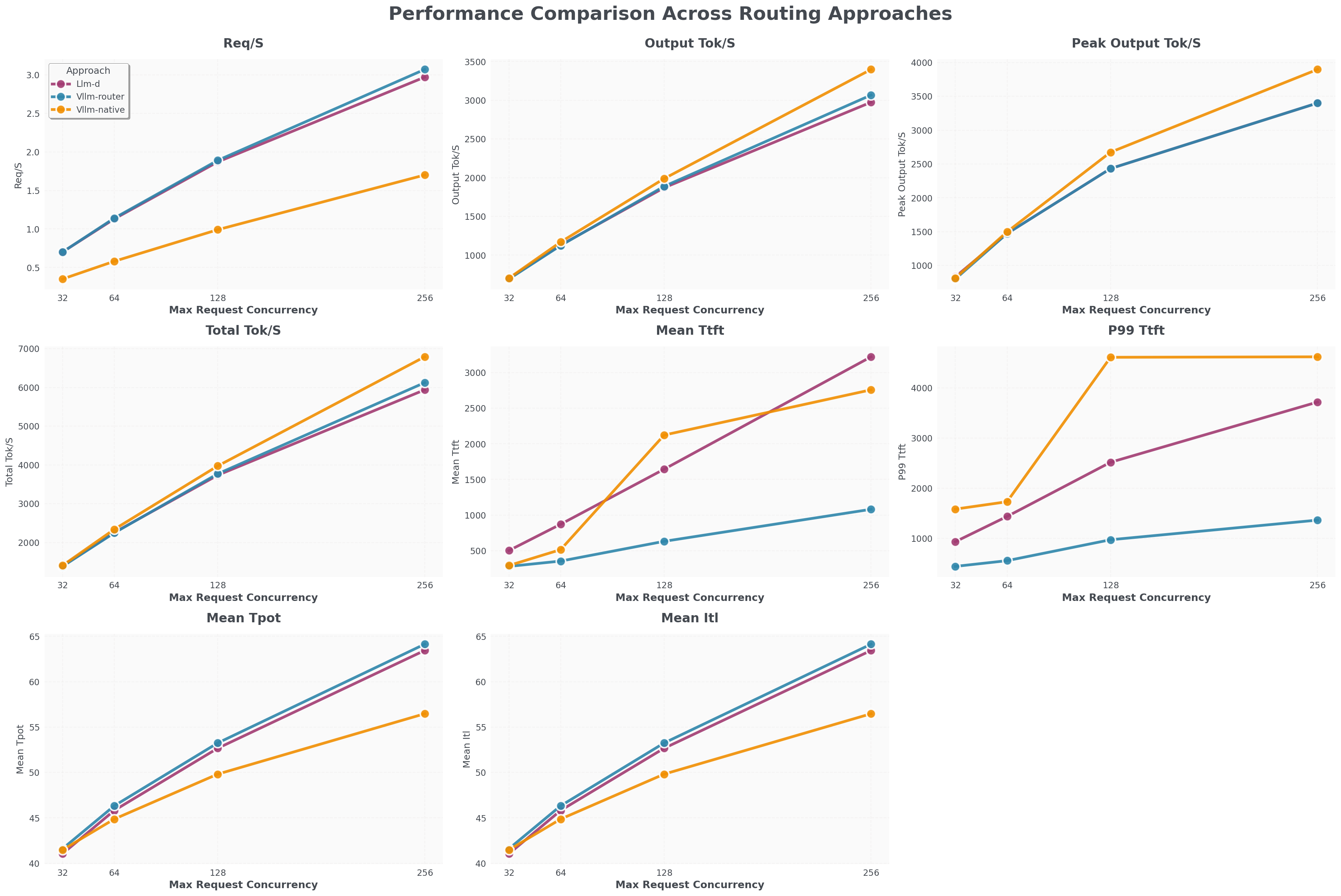 • vLLM Router (blue line) Req/S throughput is 25% higher than llm-d (purple line) and 100% higher than K8s-native load balancer (orange line).